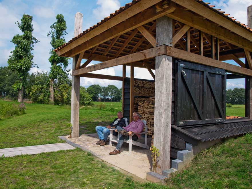 De taak voor ons hoveniersbedrijf, begin 2017, was de aanleg van een natuurlijke zwemvijver met een waterkerende bodem van klei, met daarnaast de bouw van een bijzondere schuur. In de vijver zijn stapkeien, veel waterplanten in de oevers en een ruim zwemgedeelte. Daarbij vlonders van larixhout. De tuin is voorzien van glooïng met daarachter uitzicht op het landschap. Een schuur is gebouwd met uitstraling van een hooiberg en doet dienst als relaxruimte.